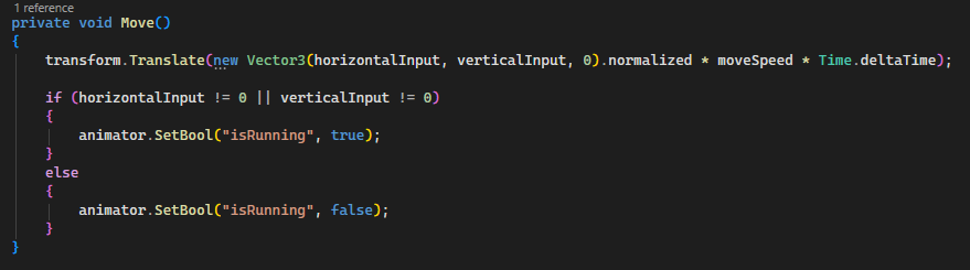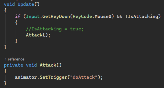 Jeg prøvede også at arbejde med at når man udførte triggeren så skulle spilleren stå helt stille og vente til animationen var færdiggjort. Det lykkes at lave men man kunne blive softlocked af det. Jeg lavede det via at have en AnimationEvent til sidst i en animation fil. Så når animationen nåede til sidst skulle den udføre en funktion som blev kaldt fra AnimationEventet til at sætte en bolsk værdi fra true til false.
